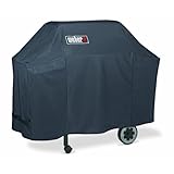 Designed to fit Weber Spirit 200/300 series gas grills and Genesis Silver A/B gas grills, this heavy-duty protective cover keeps the grill clean, dry, and looking like new by reducing its exposure to outdoor elements like wind, rain, snow, dust, and dirt. The cover slips on easily, and its fitted center and long sides keep it securely in place. Made of durable vinyl, the unit not only performs well year after year, but it also offers a sleek-looking appearance, complete with the Weber logo, that will nicely compliment any outdoor decor. The full-length grill cover measures approximately 25-1/2 by 53 by 50 inches.