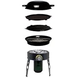 Exceptionally versatile, this portable grill allows for cooking in five different ways thanks to interchangeable cooking surfaces--a camping stove, a mini fat-free BBQ, a fat-free nonstick ribbed grill, a flat grill, and a wok. Whether camping in the great outdoors, traveling, or cooking-out in the backyard, the grill can be used to cook up everything from a hearty breakfast to s'mores under the stars. The unit's conventional grated surface works well for barbequing veggie burgers or kebobs, while its Teflon-coated nonstick grill plate can be used for grilling steak or chicken. The reversible grill plate features a skillet on the opposite side for frying eggs or making pancakes. Even more, the lid functions as a saucepan or a wok for stir-frying, and a pot of water can be placed right over the flame to boil water for instant coffee, tea, or hot cocoa. Thoughtfully designed, the grill directs grease away from food and prevents flare-ups, and its nonstick cooking surfaces ensure effortless food release. Dishwasher-safe parts make cleanup a snap, and fold-away support legs allow for compact storage and easy portability. A convenient carrying case comes included. The 7300-BTU grill should be used only with a disposable 1-pound propane cylinder (available at most grocery stores and retailers). The portable barbeque grill measures 20 by 15 by 17 inches and carries a two-year warranty.